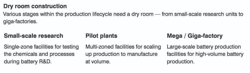 Humidity control is critical in battery dry rooms as various materials and processes used in battery production are susceptible to moisture damage.